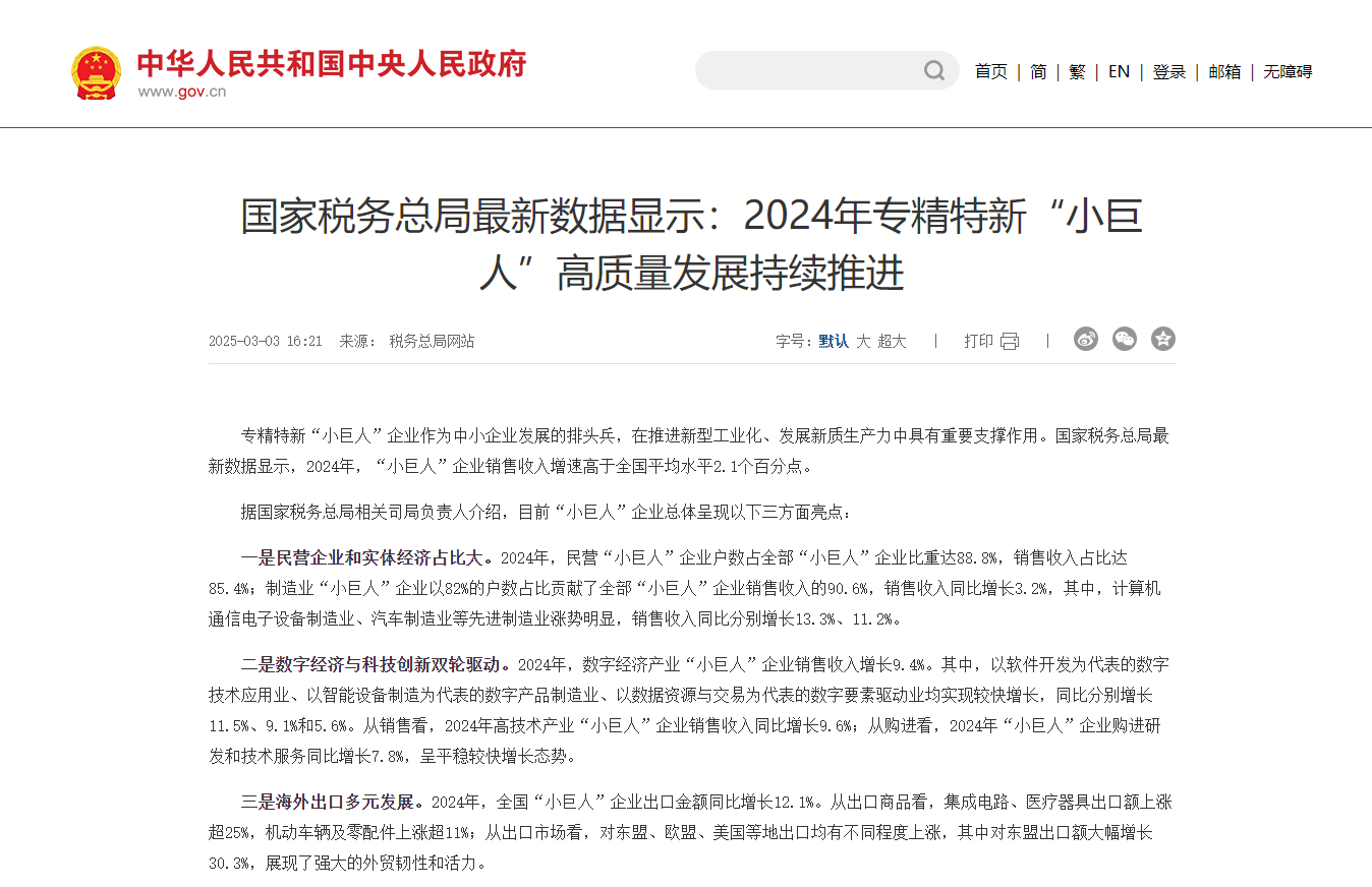 專精特新“小巨人”企業,是國家工業和信息化部為進一步貫徹落實中辦、國辦《關于促進中小企業健康發展的指導意見》,評選出的一批具有“專業化、精細化、特色化、新穎化”特征的工業中小企業,一般也是相關行業內專注于細分市場、創新能力強、市場占有率高、掌握關鍵核心技術的“排頭兵”企業。國家級“小巨人”企業,是全國中小企業評定工作中最高等級、最具權威的榮譽稱號。